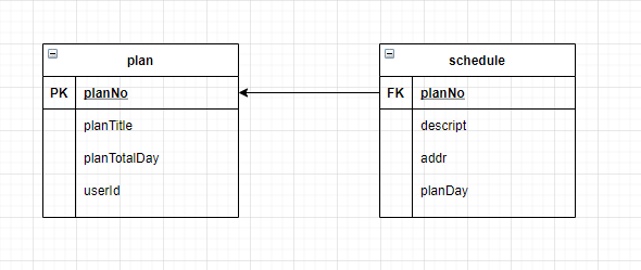 이 때 기준 테이블과 필드가 plan과 plan.planNo가 되고 참조하는 테이블이 schedule이 되므로