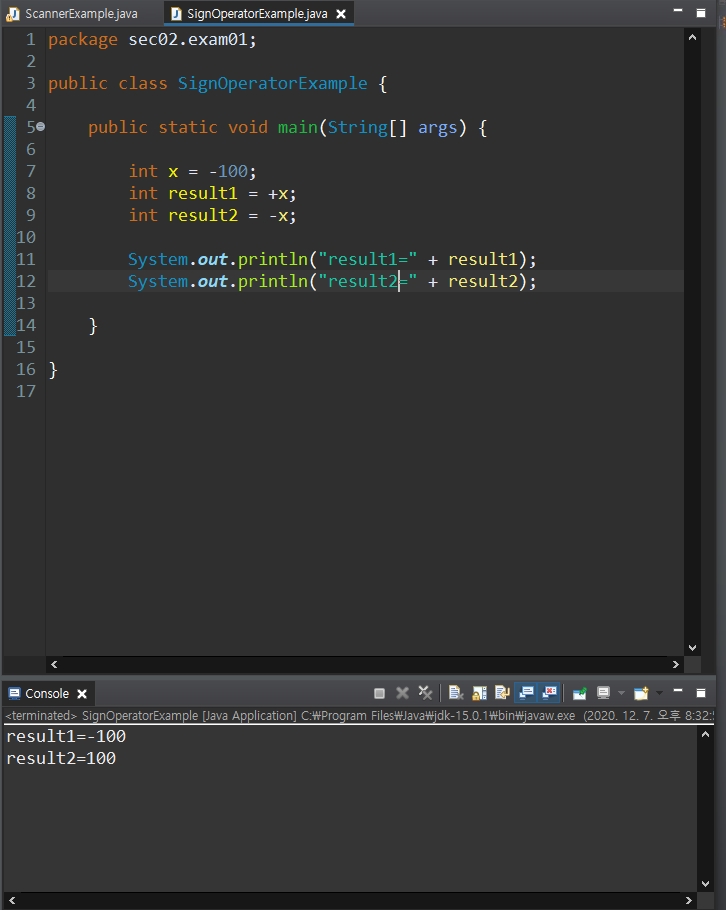 -부호 연산자가 붙은 변수값에는 부호가 바뀐다.