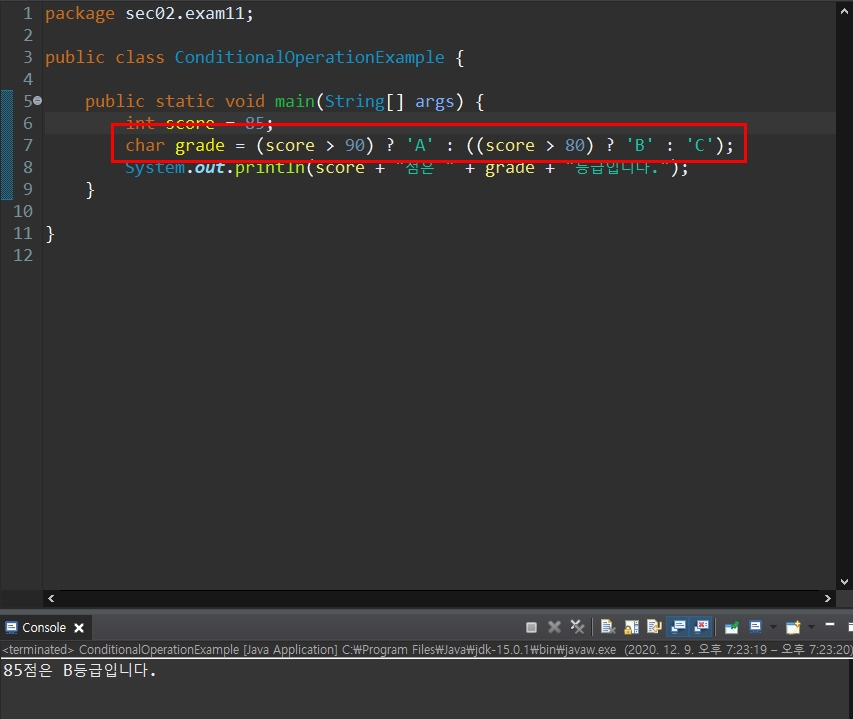 삼항 연산자가 2차례 사용된 식이다. 우선 score의 값을 비교해 A인지를 판단 후 후자의 조건으로 분기되어 한차례 더 삼항 연산자를 사용되었다.