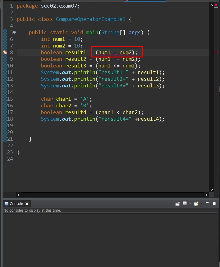 =는 대입 연산자이므로 boolean타입에서 ==연산자를 사용하지 않으면 에러가 발생한다.