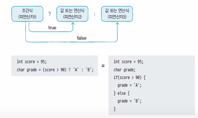 - 조건식이 true면 앞의 값을, false면 뒤에 값을 선택함