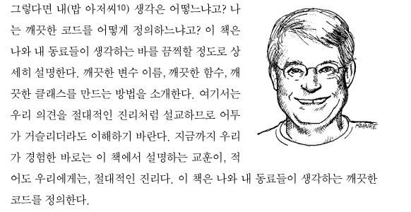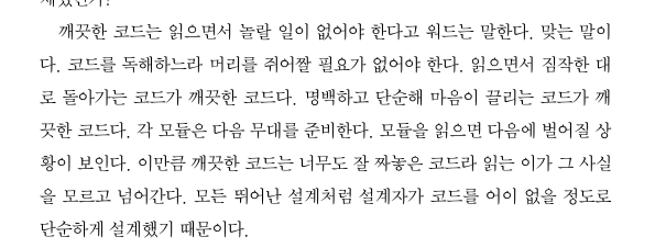 우리는 좋은 코드를 작성하는데에는 아키텍처나 프레임워크, 언어 등 고차원적인 요소가 품질을 결정한다고 생각하지만, 이 책에서는 단순한 들여쓰기 스타일로 가치를 만들어내고 사소한 것 하나에서 깨끗한 코드가 탄생한다고 알려주고 있다.