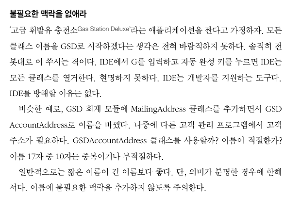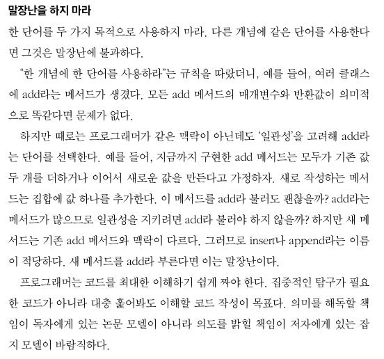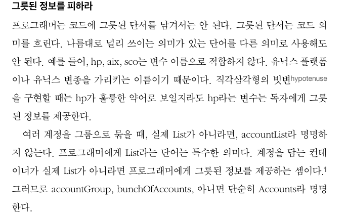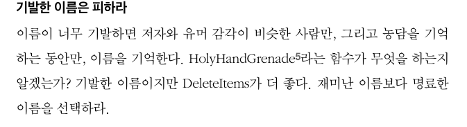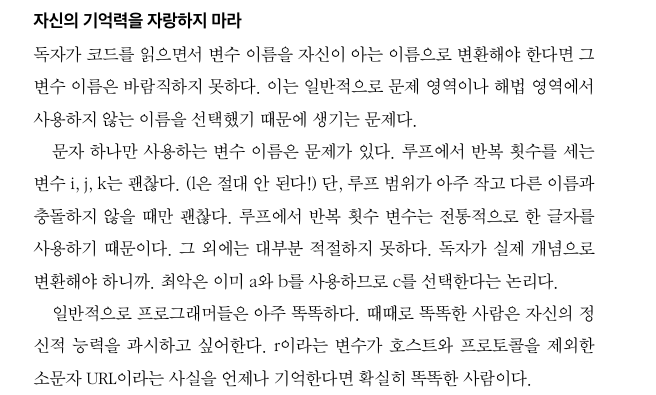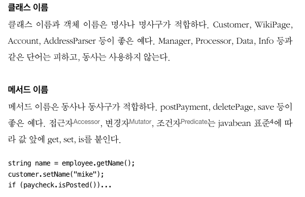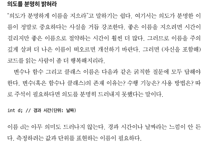 좋은 코드를 위해서는 테이블이나 자료 구조를 사용하는 읽히는 코드를 짜는데 집중을 하여야 마땅하고 생각했지만, 좋은 이름을 선택하는 것으로 코드 가독성이 높아질 수 있다.