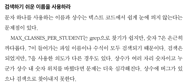 이 또한 중요한데, 값을 하드코딩하는 것을 포함하여 값의 정보로 변수를 표기하면 검색 시 불편함이 있다.