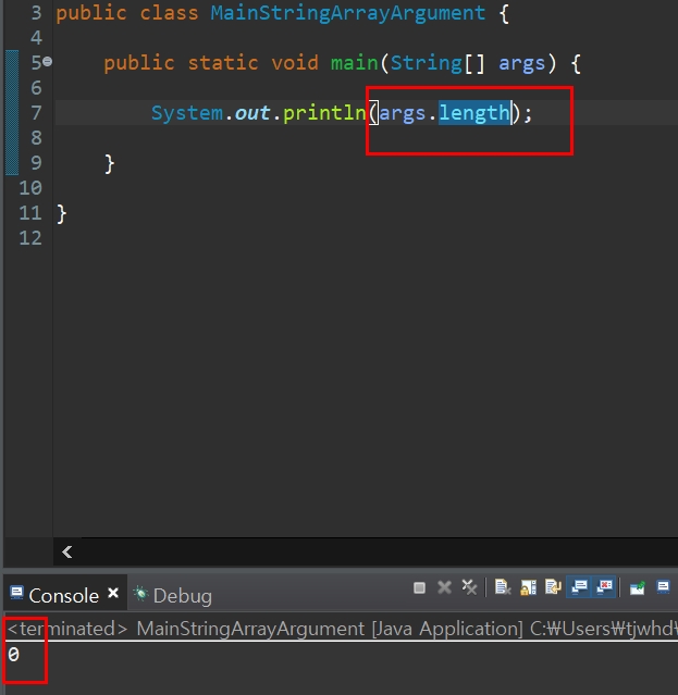 main() 메서드에 args 배열의 요소가 비어있어 main 메서드 호출 시 길이 0인 String배열이 생성되는 것을 확인할 수 있다.