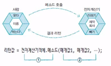 사람(객체)이 계산기(객체)의 더하기 (메서드) 기능을 이용할 때 위해서는 메서드를 호출하여 전자계산기에서의 리턴 값을 전달해준다.