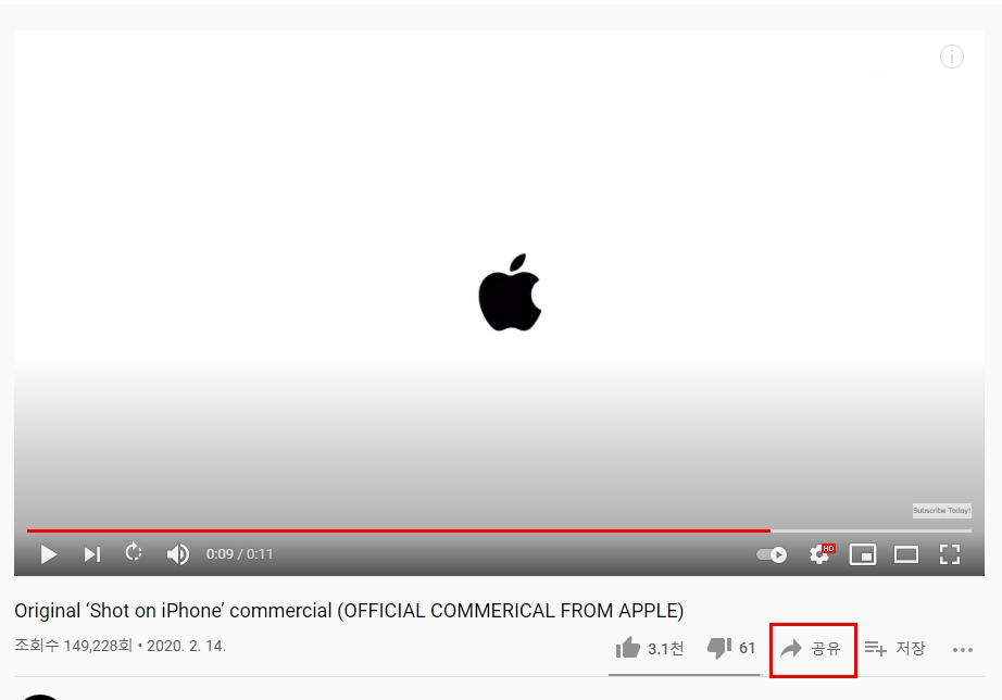 영상의 공유버튼을 누르고