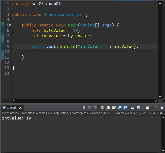 int b = a; //byte 타입 변수 a에 저장된 10을 int 타입 변수 b에 복사해서 저장