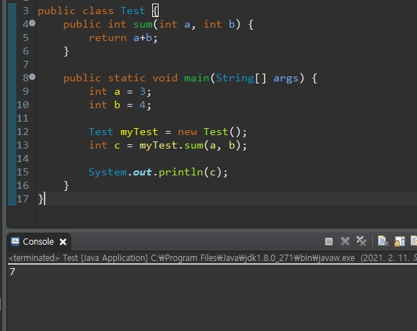 sum 메소드에 3, 4 입력값을 전달하여 7을 리턴받는 예제이다.