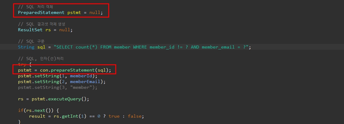 String sql = "SELECT count(*) FROM member WHERE member_id != ? AND member_email = ?";