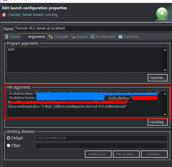 톰캣 Overview -> Open launch configuration -> Argument 탭에서 확인가능