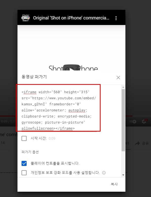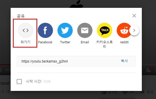 유튜브에서는 이 기능을 제공하고 있어 편하게 퍼갈 수 있다.